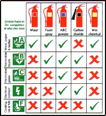 The selection and location of fire extinguisher types is a complex process and the usages shown on the diagram to the left are for general guidance only.
